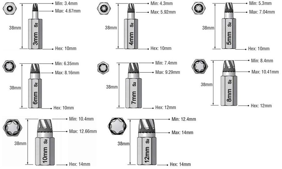 Применяются для извлечения обломанных болтов Torx, Torx plus, Torx Security.