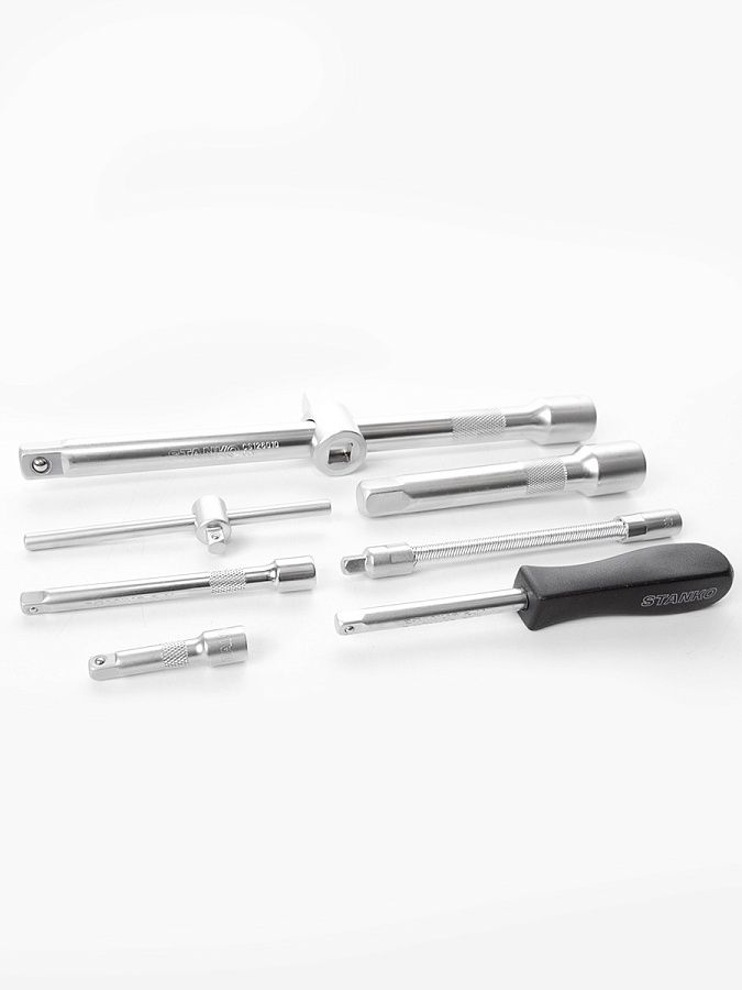 Отвертки, торцевые головки и биты основных типоразмеров выручат в разных ситуациях. Трещоточные ключи имеют механизм 72 зуба с шагом 5° и помогут раскрутить гайки в труднодоступных местах. Карданы и удлинители нужны для еще более эффективного решения задач.