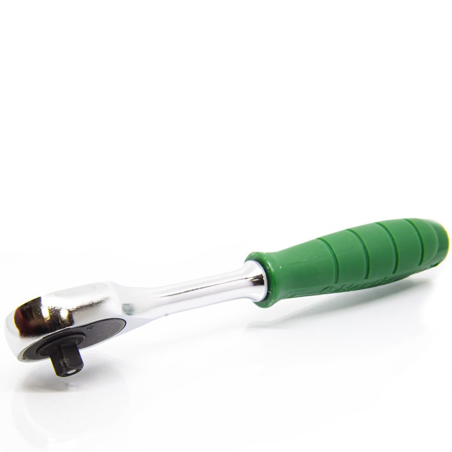 Трещотка имеет 24-зубцовый механизм с флажковым переключателем. Эргономичная ручка из маслобензостойкого пластика позволяет не проскальзывать рукоятке во время работы.